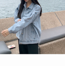 韩国代购外套 2023春秋女装褶皱设计复古磨白浅蓝色宽松牛仔夹克